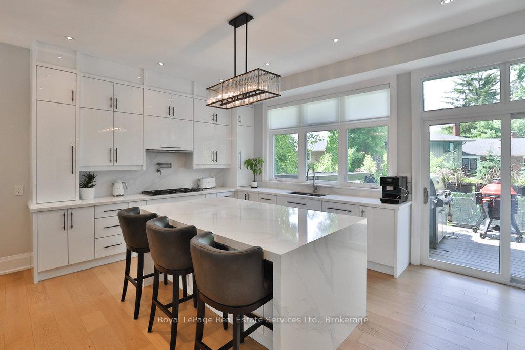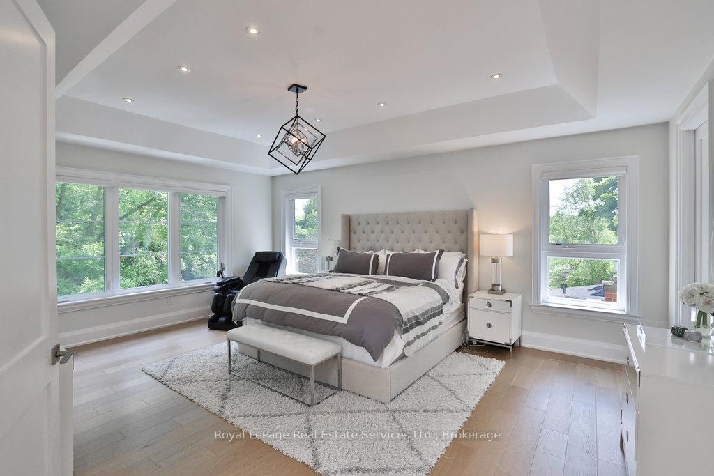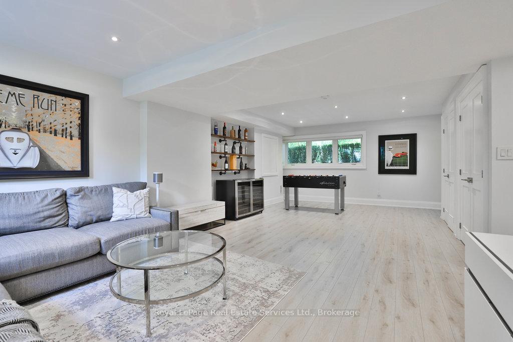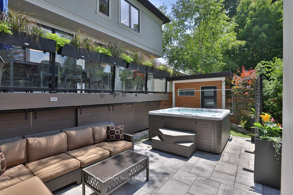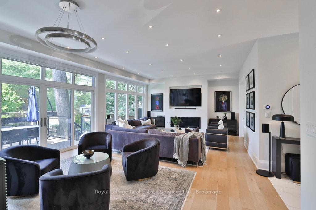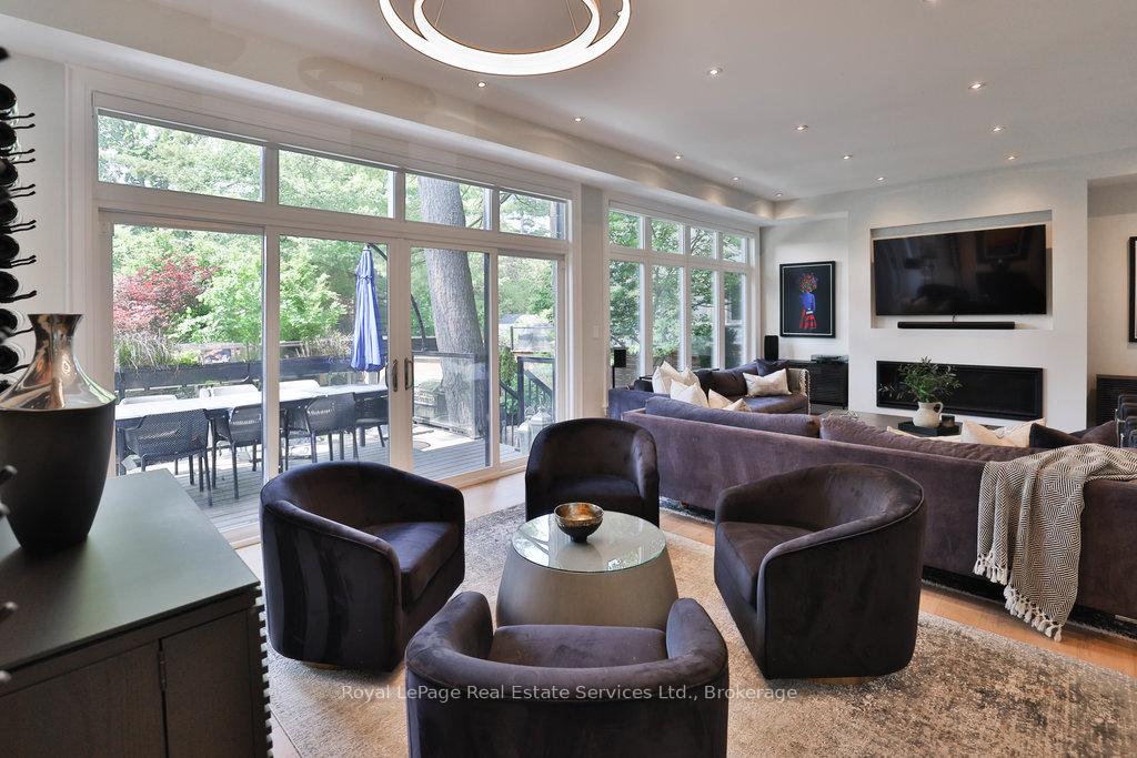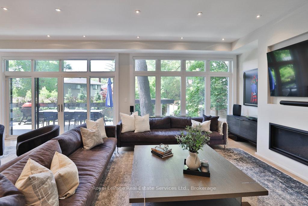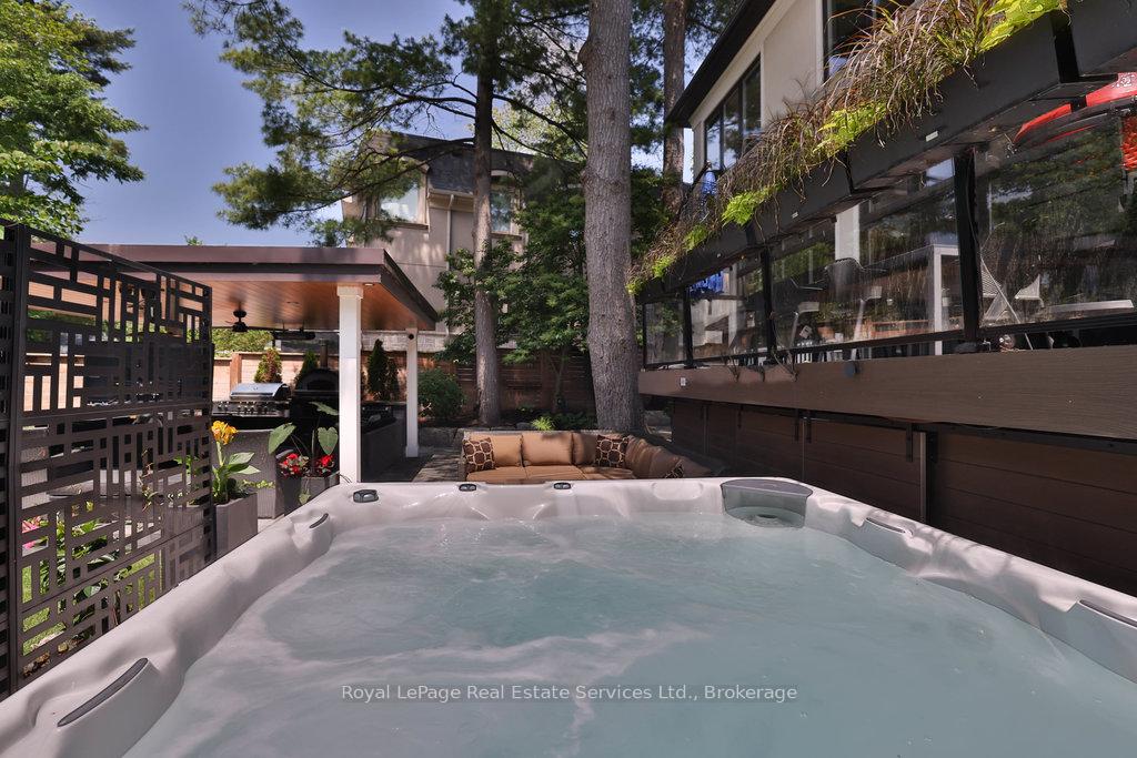 Stunning contemporary designed custom 4+1 bedroom, 5 bathroom home in prestigious Southeast Oakville, directly facing Charnwood Park. With over 4,000 sq ft of luxurious living space across three levels, this home features 10ft ceilings on the main floor and 9ft on the second. The main level offers a formal living and dining room, spacious family room, private office, and powder room. Wall-to-wall windows flood the space with natural light. The modern kitchen includes a large island, quartz countertops, high-end cabinetry, and top-tier appliances and walk-out to composite deck. Premium finishes throughout include floating stairs, solid core doors, designer lighting, coffered ceilings, heated floors, a convenient upper-level laundry room, and custom motorized blinds in the main and primary bedrooms. All 4 upper-level bedrooms feature their own private ensuite. The fully finished basement includes a large recreation room, oversized windows, additional bedroom, and full bath, ideal as an in-law/teenage suite. Additionally there are multiple storage closets and inside entry to double car garage with epoxy floors. Outside, enjoy a stunning fully fenced backyard nestled among mature trees, perfect for entertaining. Features include a large deck, outdoor kitchen with gas BBQ and Fontana Forni pizza oven, 8-person Beachcomber hot tub, natural gas firebowl, beautiful gardens, a custom pergola with full electrical and pivoting TV mount, two custom sheds, and an irrigation system. Additional upgrades include an EV charger, home security cameras, and custom closets. Located in Oakville's top school district (Maple Grove PS, EJ James, St. Vincents and Oakville Trafalgar HS) and just a short walk to the lake, parks, and scenic trails. Truly one of a kind.