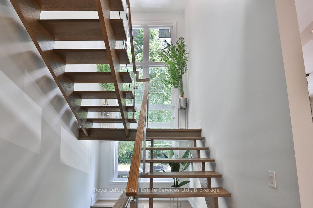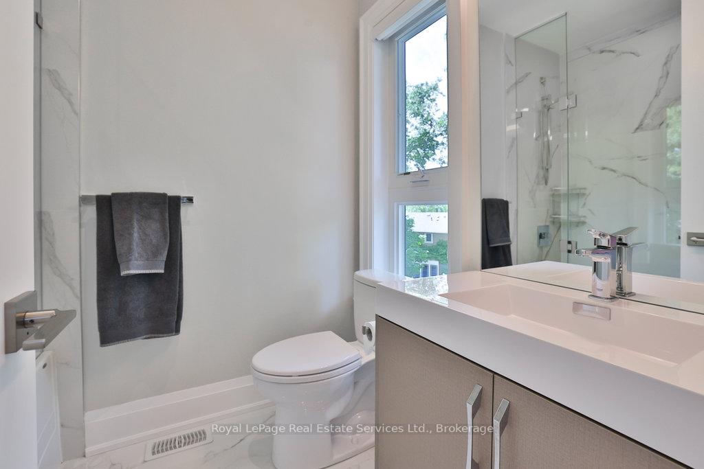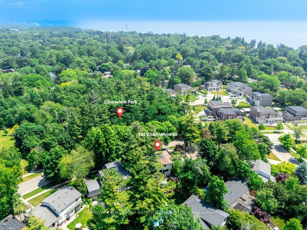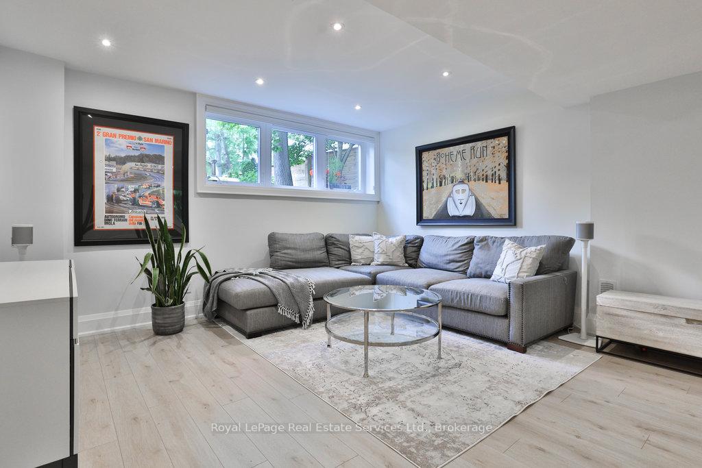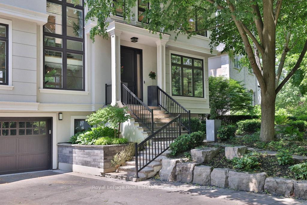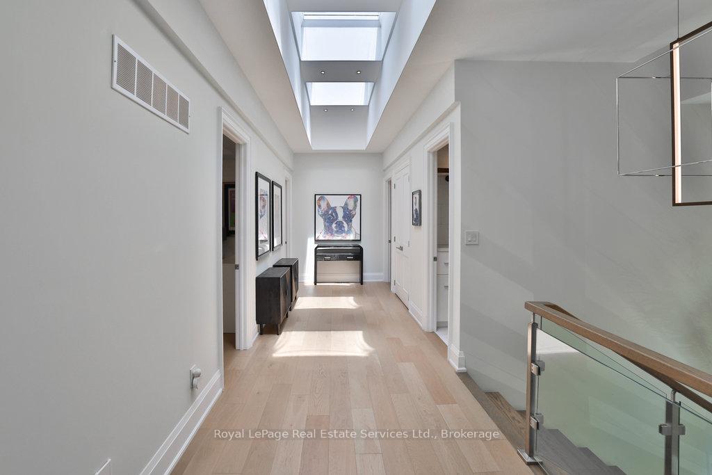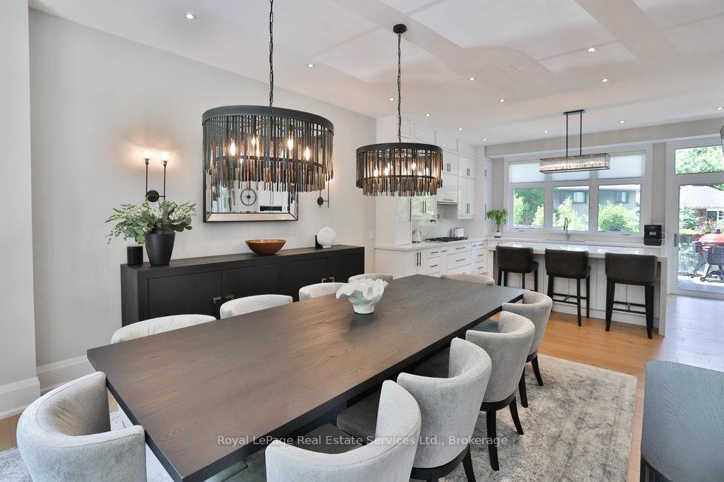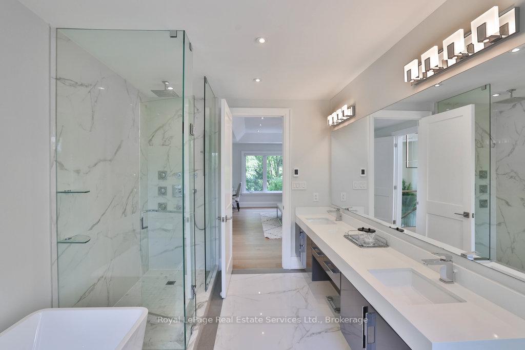 Stunning contemporary designed custom 4+1 bedroom, 5 bathroom home in prestigious Southeast Oakville, directly facing Charnwood Park. With over 4,000 sq ft of luxurious living space across three levels, this home features 10ft ceilings on the main floor and 9ft on the second. The main level offers a formal living and dining room, spacious family room, private office, and powder room. Wall-to-wall windows flood the space with natural light. The modern kitchen includes a large island, quartz countertops, high-end cabinetry, and top-tier appliances and walk-out to composite deck. Premium finishes throughout include floating stairs, solid core doors, designer lighting, coffered ceilings, heated floors, a convenient upper-level laundry room, and custom motorized blinds in the main and primary bedrooms. All 4 upper-level bedrooms feature their own private ensuite. The fully finished basement includes a large recreation room, oversized windows, additional bedroom, and full bath, ideal as an in-law/teenage suite. Additionally there are multiple storage closets and inside entry to double car garage with epoxy floors. Outside, enjoy a stunning fully fenced backyard nestled among mature trees, perfect for entertaining. Features include a large deck, outdoor kitchen with gas BBQ and Fontana Forni pizza oven, 8-person Beachcomber hot tub, natural gas firebowl, beautiful gardens, a custom pergola with full electrical and pivoting TV mount, two custom sheds, and an irrigation system. Additional upgrades include an EV charger, home security cameras, and custom closets. Located in Oakville's top school district (Maple Grove PS, EJ James, St. Vincents and Oakville Trafalgar HS) and just a short walk to the lake, parks, and scenic trails. Truly one of a kind.