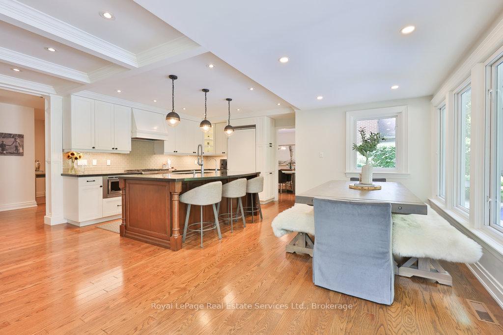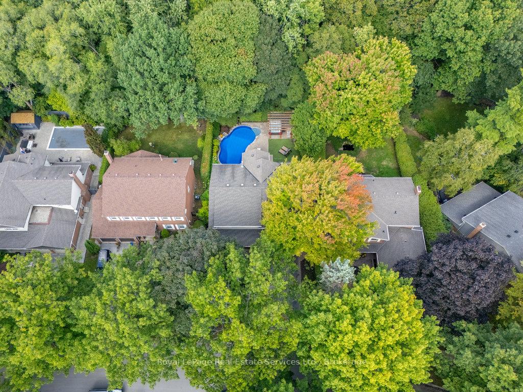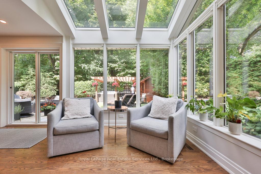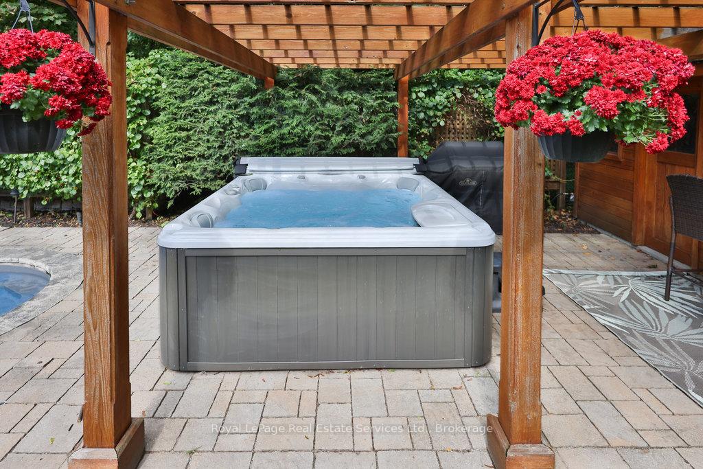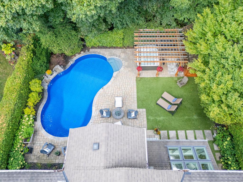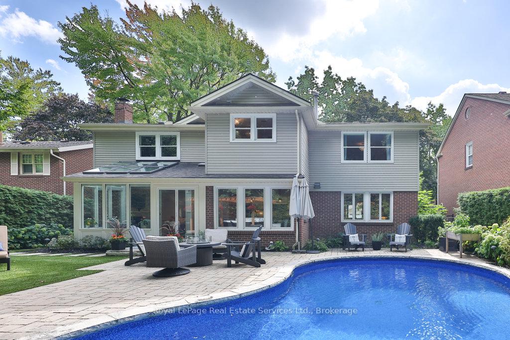 Stunning, fully renovated family home in desirable South East Oakville neighbourhood, backing onto serene greenspace & parkland. Thoughtfully updated throughout with high-end custom finishes, this south-facing property offers over 4,400 sq ft of beautifully finished living space, including 4+1 bedrooms & 3.5 baths. The spacious living & dining rooms feature oversized windows that flood the space with natural light. An impressive open-concept layout connects the family room, sunroom & gourmet kitchen, complete with a large island & breakfast area overlooking the private backyard with a saltwater pool. The expanded primary suite includes a luxurious 5-pc ensuite & generous walk-in closet. Three additional bedrooms offer ample closet space and are served by a stylish 3-pc main bath. The lower level is designed for entertaining & relaxation, with a large rec room, custom bar, built-in shelving, fireplace, games area, dedicated exercise room with cork flooring, 3-pc bath & abundant storage. Private backyard retreat complete with a saltwater pool, hot Sundance Hamilton Hot Tub, waterfall, pergola & lush perennial gardens. Relax in the hot tub and poolside bar with built-in shelving, fridge & TV. The addition of synthetic grass ensures a low-maintenance green space you can enjoy year-round. Recent updates include "Magic Windows" patio door & rear windows (2021), pool liner (2024), Saltwater chlorinator (2023), Sundance "Hamilton" Hot Tub (2021), pool bar with built-in shelving, fridge & TV (2021), synthetic grass in backyard (2021), Interior doors & hardware on main level (2021), professional spray painting of kitchen cabinets & fireplace surround (2021). Additional highlights include neutral décor, hardwood flooring, heated floors, coffered ceilings, custom built-ins, an abundance of storage & much more! Located on a quiet street in a top-rated school district with easy access to major highways & GO train - truly a perfect blend of luxury, comfort & convenience.