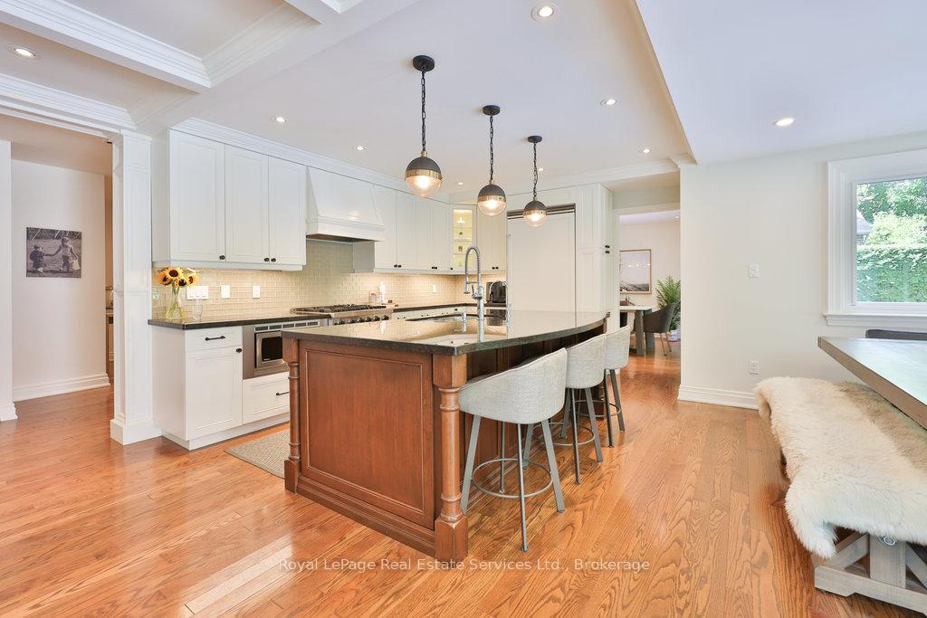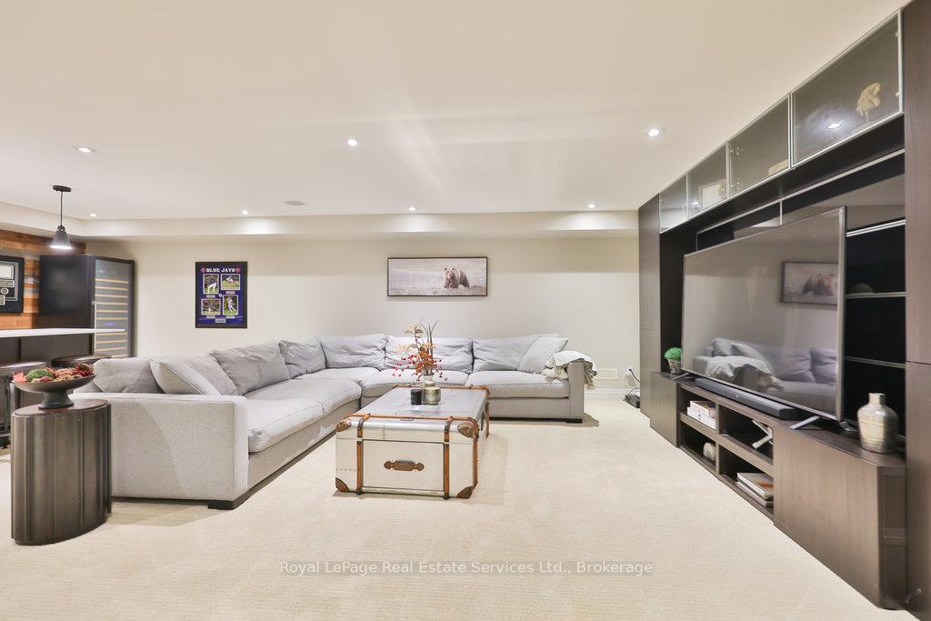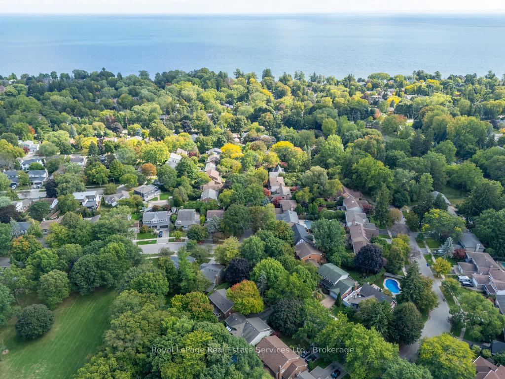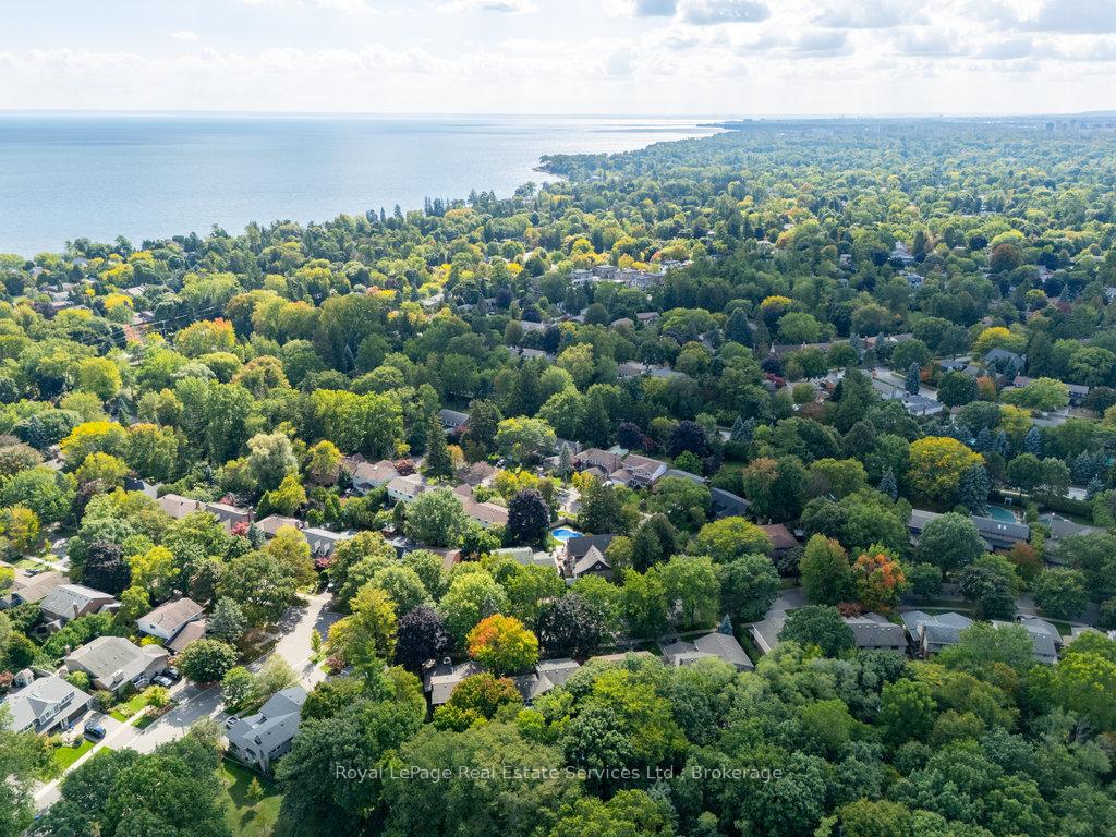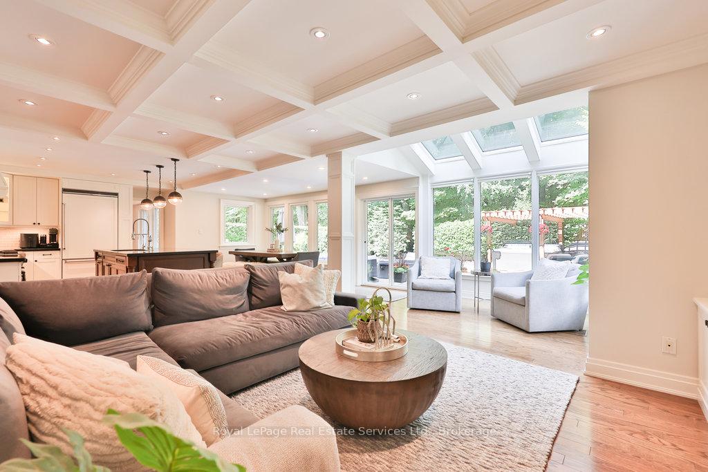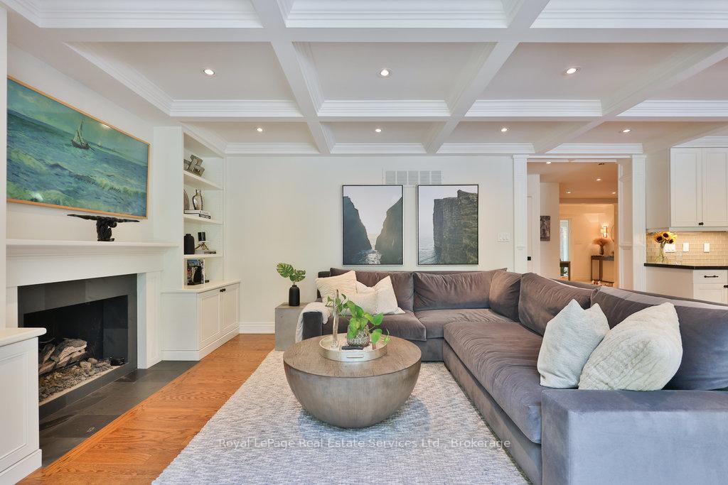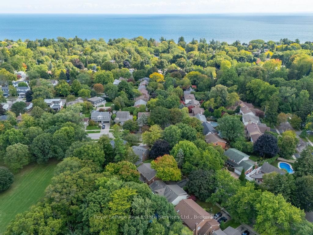 Stunning, fully renovated family home in desirable South East Oakville neighbourhood, backing onto serene greenspace & parkland. Thoughtfully updated throughout with high-end custom finishes, this south-facing property offers over 4,400 sq ft of beautifully finished living space, including 4+1 bedrooms & 3.5 baths. The spacious living & dining rooms feature oversized windows that flood the space with natural light. An impressive open-concept layout connects the family room, sunroom & gourmet kitchen, complete with a large island & breakfast area overlooking the private backyard with a saltwater pool. The expanded primary suite includes a luxurious 5-pc ensuite & generous walk-in closet. Three additional bedrooms offer ample closet space and are served by a stylish 3-pc main bath. The lower level is designed for entertaining & relaxation, with a large rec room, custom bar, built-in shelving, fireplace, games area, dedicated exercise room with cork flooring, 3-pc bath & abundant storage. Private backyard retreat complete with a saltwater pool, hot Sundance Hamilton Hot Tub, waterfall, pergola & lush perennial gardens. Relax in the hot tub and poolside bar with built-in shelving, fridge & TV. The addition of synthetic grass ensures a low-maintenance green space you can enjoy year-round. Recent updates include "Magic Windows" patio door & rear windows (2021), pool liner (2024), Saltwater chlorinator (2023), Sundance "Hamilton" Hot Tub (2021), pool bar with built-in shelving, fridge & TV (2021), synthetic grass in backyard (2021), Interior doors & hardware on main level (2021), professional spray painting of kitchen cabinets & fireplace surround (2021). Additional highlights include neutral décor, hardwood flooring, heated floors, coffered ceilings, custom built-ins, an abundance of storage & much more! Located on a quiet street in a top-rated school district with easy access to major highways & GO train - truly a perfect blend of luxury, comfort & convenience.