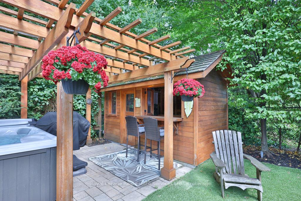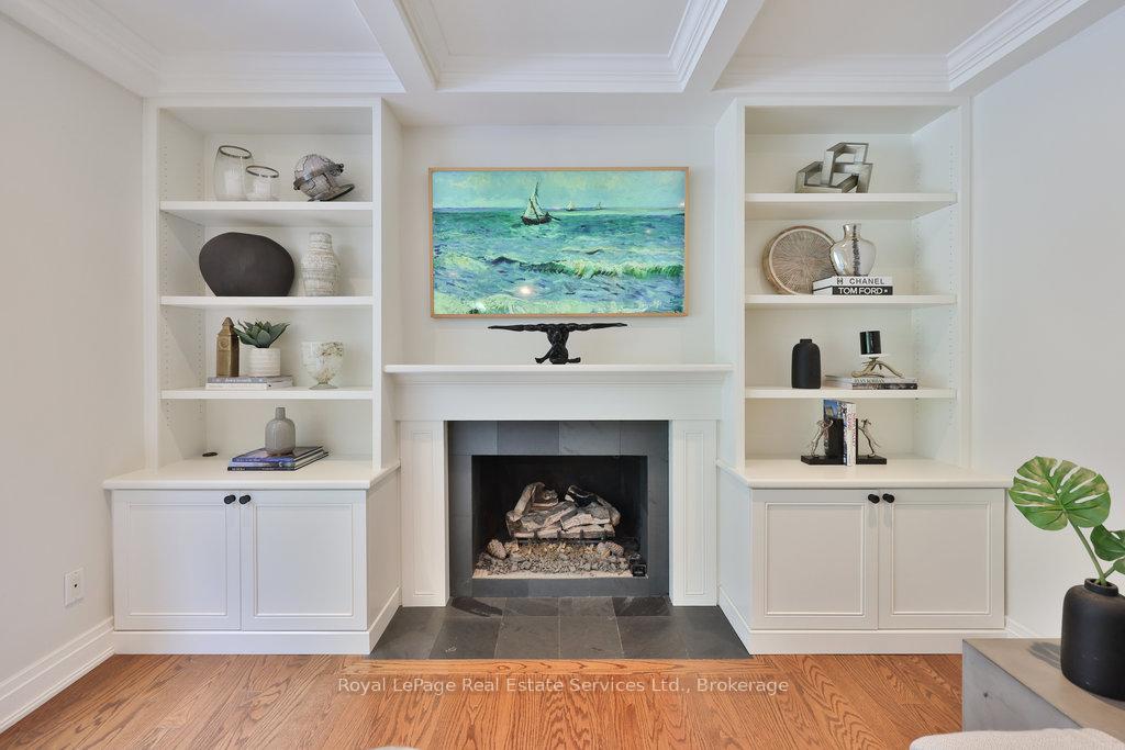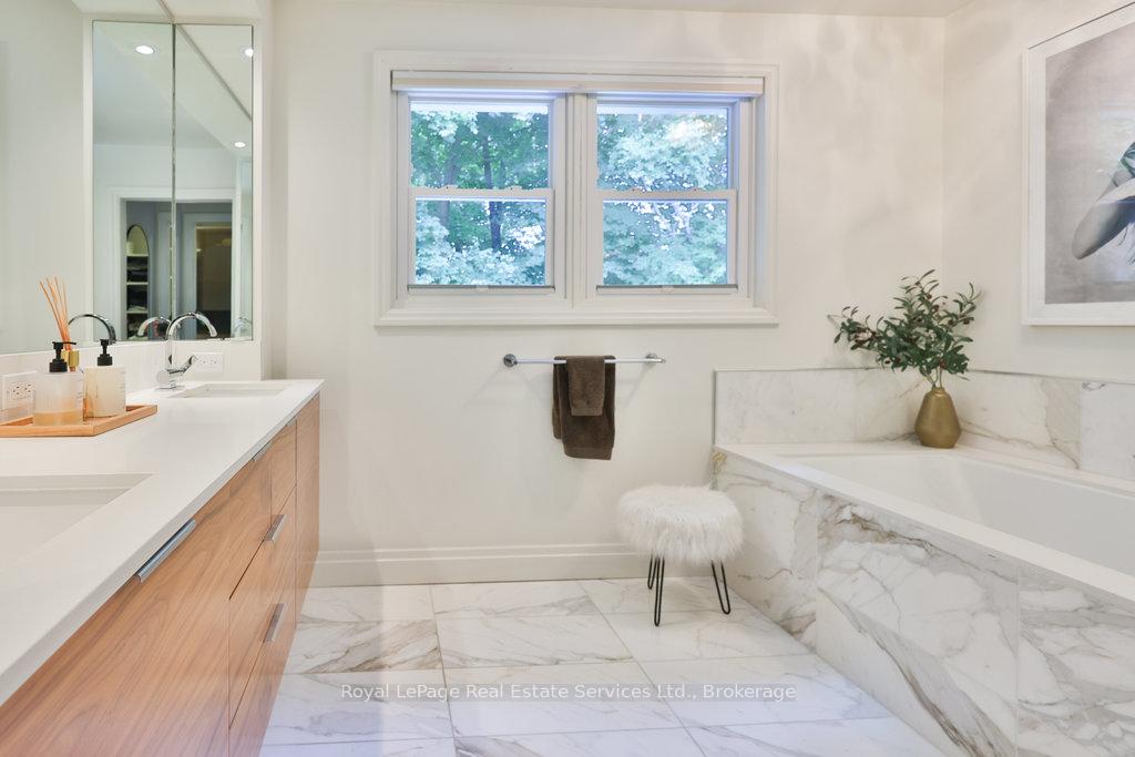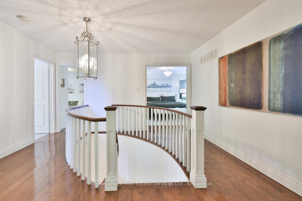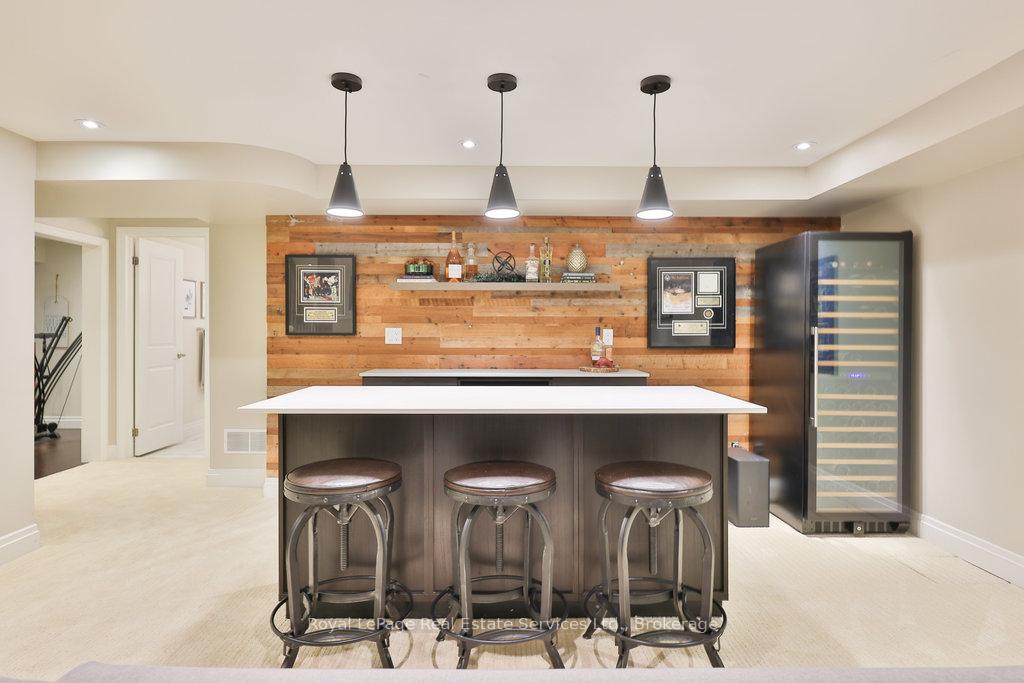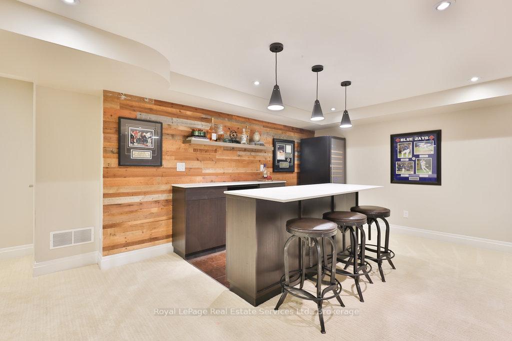 Stunning, fully renovated family home in desirable South East Oakville neighbourhood, backing onto serene greenspace & parkland. Thoughtfully updated throughout with high-end custom finishes, this south-facing property offers over 4,400 sq ft of beautifully finished living space, including 4+1 bedrooms & 3.5 baths. The spacious living & dining rooms feature oversized windows that flood the space with natural light. An impressive open-concept layout connects the family room, sunroom & gourmet kitchen, complete with a large island & breakfast area overlooking the private backyard with a saltwater pool. The expanded primary suite includes a luxurious 5-pc ensuite & generous walk-in closet. Three additional bedrooms offer ample closet space and are served by a stylish 3-pc main bath. The lower level is designed for entertaining & relaxation, with a large rec room, custom bar, built-in shelving, fireplace, games area, dedicated exercise room with cork flooring, 3-pc bath & abundant storage. Private backyard retreat complete with a saltwater pool, hot Sundance Hamilton Hot Tub, waterfall, pergola & lush perennial gardens. Relax in the hot tub and poolside bar with built-in shelving, fridge & TV. The addition of synthetic grass ensures a low-maintenance green space you can enjoy year-round. Recent updates include "Magic Windows" patio door & rear windows (2021), pool liner (2024), Saltwater chlorinator (2023), Sundance "Hamilton" Hot Tub (2021), pool bar with built-in shelving, fridge & TV (2021), synthetic grass in backyard (2021), Interior doors & hardware on main level (2021), professional spray painting of kitchen cabinets & fireplace surround (2021). Additional highlights include neutral décor, hardwood flooring, heated floors, coffered ceilings, custom built-ins, an abundance of storage & much more! Located on a quiet street in a top-rated school district with easy access to major highways & GO train - truly a perfect blend of luxury, comfort & convenience.